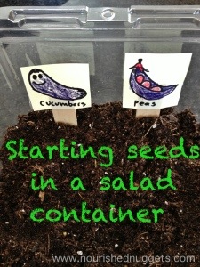 We might be a tad bit early for starting our seeds this year, but this winter has been waaaaay too long here in Minnesnowta! I need something green and sprouting in my life. Plus, a seed packet costs next to nothing and I just love teaching my little hobbits about planting and growing things. We bought one of those garden starter mini green house things from Home Depot, but it currently resides in our garden shed that has a fairly large snow bank blocking the door…..so today we grow seeds in a salad container. I have to admit that I am feeling pretty psyched about this project idea!