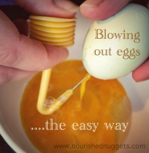 - Use the “pumping” tool to pierce and blow out the egg contents through that hole. It basically creates a high pressure inside of the egg that forces the contents out through the hole and the shell remains intact for you to decorate