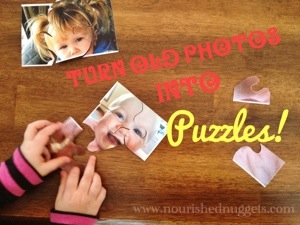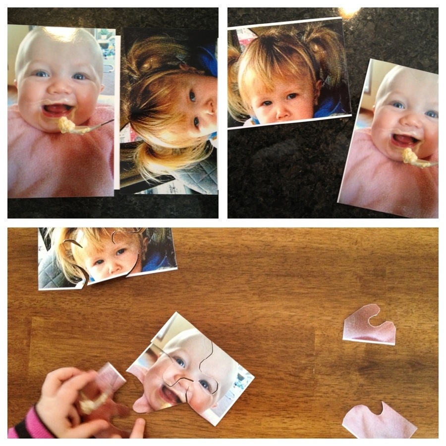 My daughter is going through a major puzzle phase lately and I think we have bought all of the puzzles that Target carries. We love recycling stuff so I decided to make her a few puzzles out of some old photos I had left over from scrapbooking. Bonus: she giggles the entire time putting them together because they are silly family photos!