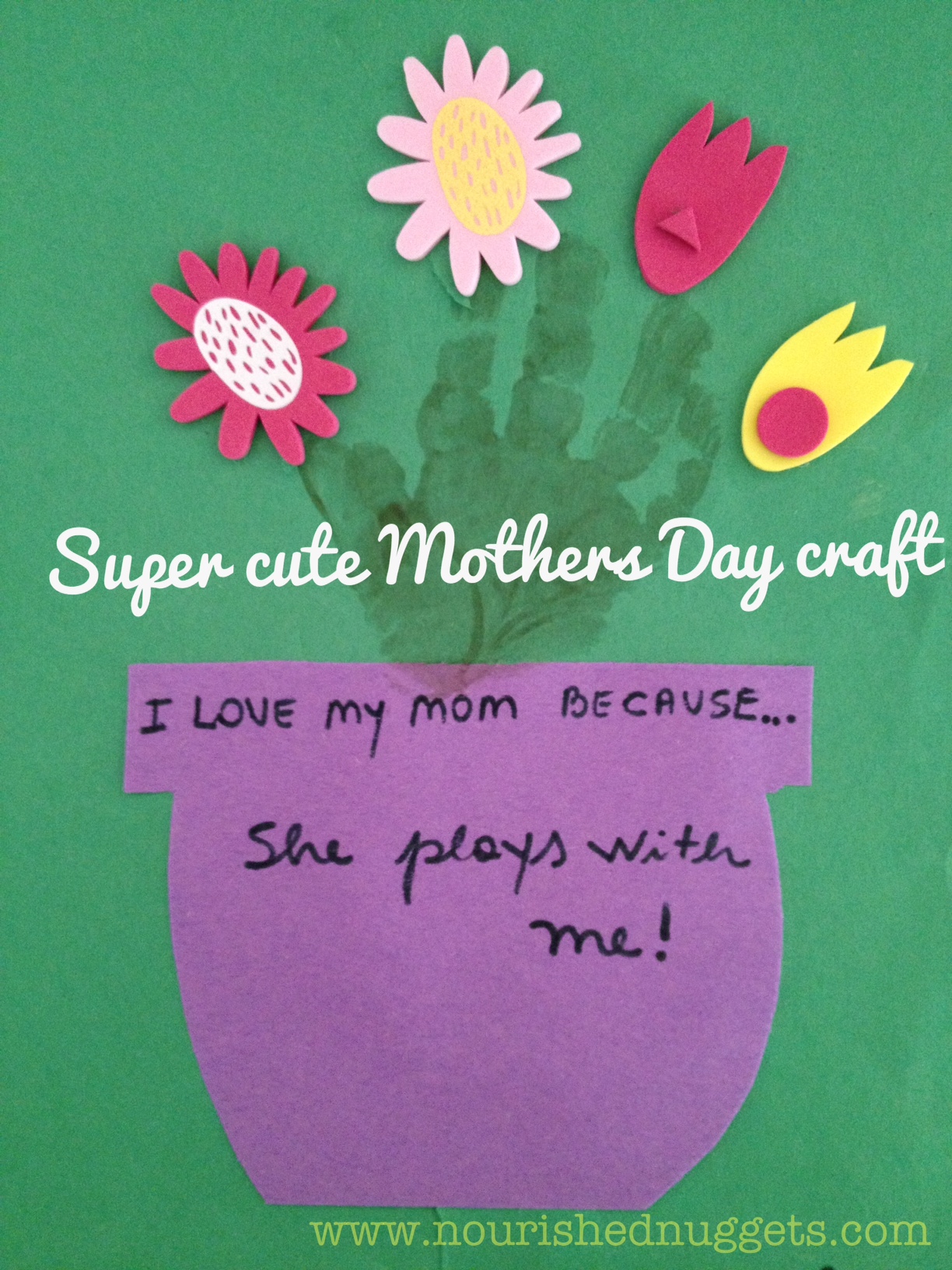 Pour some paint onto a plate, dip your child’s hand in it. Make a print on the paper. Let dry. The fingers become the “stems”. After its completely dried then add the stickers. Glue on the pot. Tada! A super cute and easy Mother’s Day craft